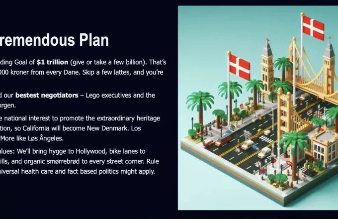 Το «τρομερό σχέδιο» (Tremendous Plan) εξαγοράς της αμερικανικής, ηλιόλουστης πολιτείας προτείνει να αγοράσουν οι Δανοί την Καλιφόρνια για 1 τρισεκατομμύριο δολάρια και μια «προσφορά δανέζικων αρτοσκευασμάτων »- πολύ λιγότερο από το ΑΕΠ των 4 τρισεκατομμυρίων δολαρίων της Καλιφόρνια το 2024.