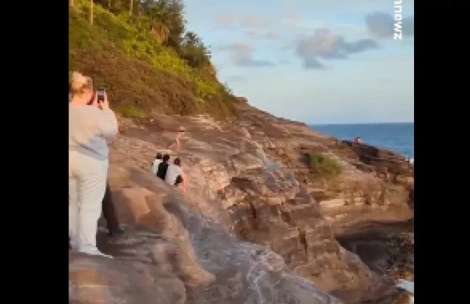 Την στιγμή, που ο 28χρονος γυμναστής και αθλητής του ράγκμπι, Σαντιάγκο Μπουρντιέ κάνει βουτιά στη θάλασσα από γκρεμό 15 μέτρων γνωστό ως Spitting Cave, της Χαβάης με αποτέλεσμα να χάσει τη ζωή του, καταγράφει βίντεο.