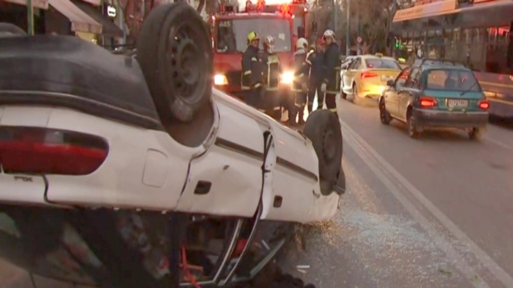 Αυτοκίνητο με κατεύθυνση προς την Αθήνα, έπεσε πάνω σε σταθμευμένα οχήματα και μετά την πρόσκρουση αναποδογύρισε. Κάμερα από επιχείρηση έχει καταγράψει την στιγμή του ατυχήματος.
