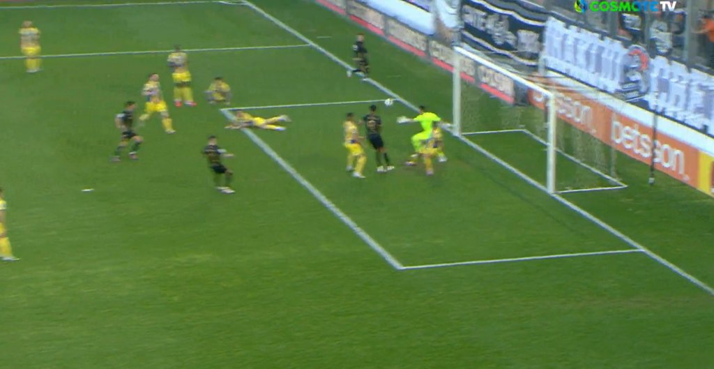Στο 12ο λεπτό, από την τρομερή ατομική ενέργεια του Χατζηθεοδωρίδη, που πέρασε εύκολα τον Αλάγκμπε, έβγαλε πάσα πάρε-βάλε στον Φούντα, ο οποίος απέναντι σπό τον Τσιντώτα, έστειλε άουτ τη μπάλα.