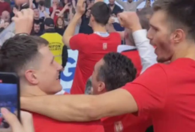 Ο Ερυθρός Αστέρας νίκησε την Παρτίζαν και κατέκτησε το Κύπελλο Σερβίας, στο Μπάσκετ, με τους παίκτες του Σφαιρόπουλου να πανηγυρίζουν, μαζί με τους οπαδούς τους, την επιτυχία.