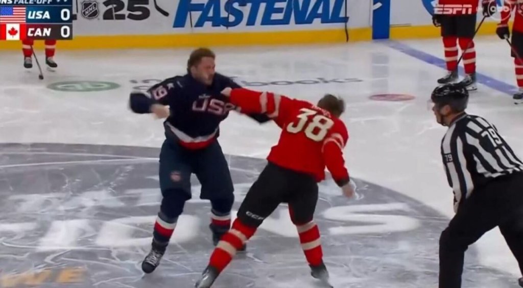Την αρχή έκαναν μόλις δύο δευτερόλεπτα από τη σέντρα ο Matthew Tkachuk των ΗΠΑ και ο Brandon Hagel του Καναδά. Τη σκυτάλη πήραν ο αδελφός του πρώτου, Brady και ο Καναδός Sam Bennett ενώ στον τρίτο καβγά συμμετείχαν ο Αμερικανός J T Miller και ο αντίπαλός του από τον Καναδά Colton Parayko.