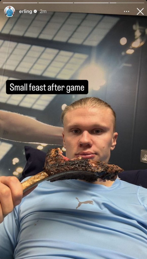 Λίγο μετά την επιβλητική νίκη της Σίτι επί της Νιούκαστλ (4-0), ο Χάαλαντ μοιράστηκε με τους ακολούθους του στα social media μια φωτογραφία με μία μισοφαγωμένη μπριζόλα, γράφοντας χαρακτηριστικά: "Μικρό γεύμα μετά τον αγώνα." Ένα "μικρό γεύμα" για τον Νορβηγό, που όμως είναι μέρος μιας απίστευτης δίαιτας 6.000 θερμίδων την ημέρα.