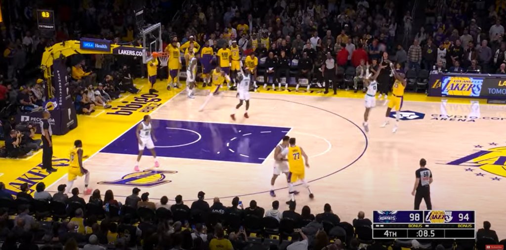 Με 2:35 λεπτά για το φινάλε, οι δυο ομάδες ήταν ισόπαλες 90-90 και ο Μπρίτζες ευστόχησε σε τρίποντο για το 90-93. Στο μικρό σερί 4-0 των Λέικερς, οι φιλοξενούμενοι απάντησαν με τρίποντο του Σμιθ, για το 94-96 στα 47.1 δευτερόλεπτα, για να ακολουθήσει χαμένη επίθεση, από τους γηπεδούχους, και τους Χόρνετς να παίρνουν προβάδισμα δυο κατοχών, 94-98 στα 14 δευτερόλεπτα. Το τρίποντο του Λεμπρόν από τα οκτώ μέτρα έφερε τους Λέικερς σε απόσταση αναπνοής, 97-98 στα 6.1 δευτερόλεπτα, με τον Μπολ να ευστοχεί σε δύο βολές για το 97-100. Ο Τζέιμς είχε τα τελευταία δύο σουτ για να στείλει το ματς στην παράταση, όμως δεν βρήκε στόχο και οι Χόρνετς πήραν τη νίκη.