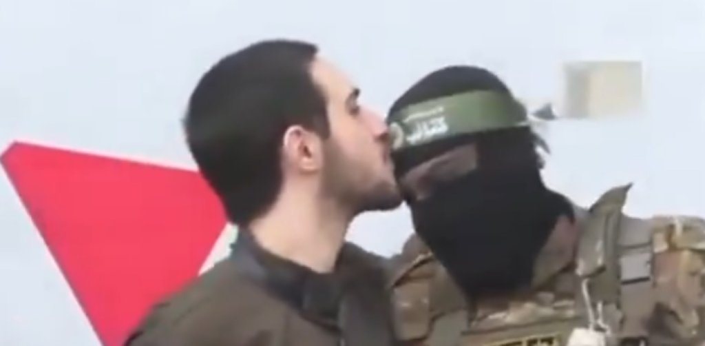 Σε πλάνα που κυκλοφόρησαν, ο Σεμ Τοβ διακρίνεται να φιλάει χαμογελαστός τους άντρες της Χαμάς κατά την απελευθέρωσή του...