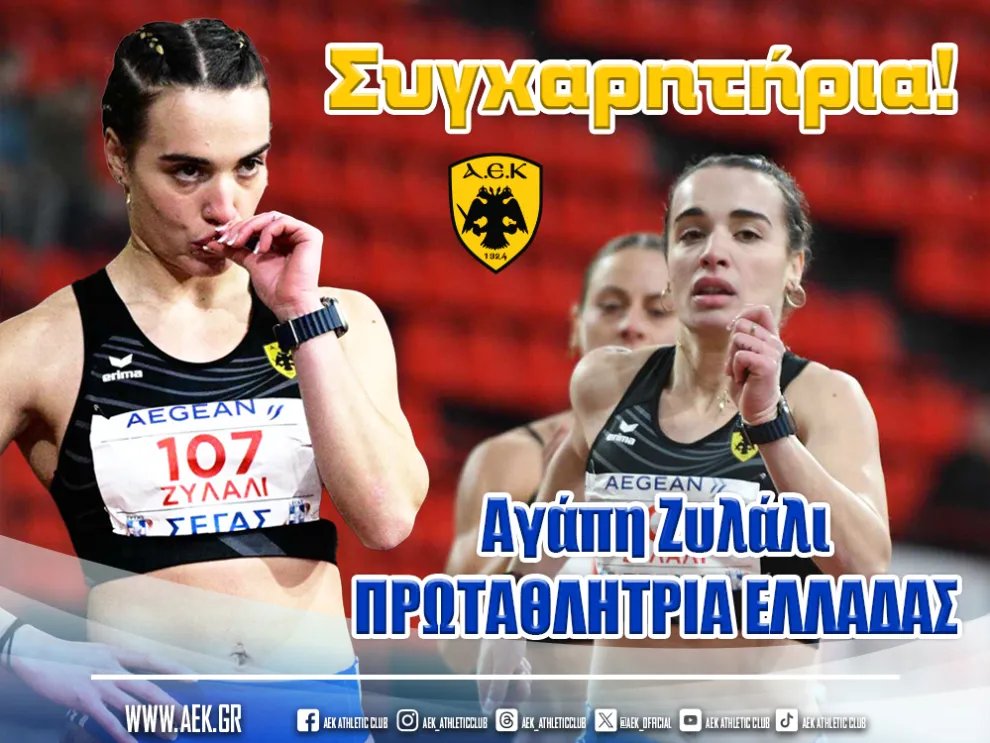 Η Αγάπη Ζυλάλι κατέκτησε το χρυσό μετάλλιο στα 400 μ. Γυναικών, με χρόνο 56.42″, κάνοντας υπερήφανους όλους τους ανθρώπους της ΑΕΚ. Η Ζυλάλι αναδείχθηκε έτσι Πρωταθλήτρια Ελλάδας στον Κλειστό Στίβο, μετά και τη συνεισφορά της στην κατάκτηση του Πανελληνίου Πρωταθλήματος Ανωμάλου Δρόμου.