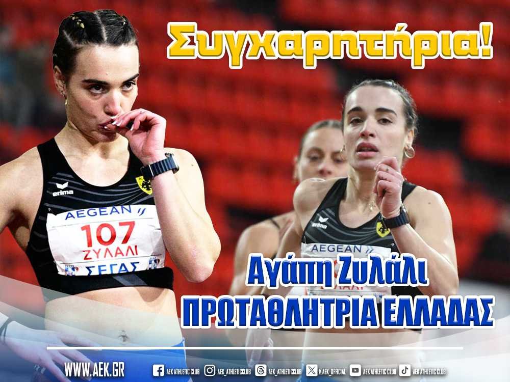 «Όλη η οικογένεια της ΑΕΚ είναι υπερήφανη για την, δικιά μας, πρωταθλήτρια Ελλάδας». Με αυτό το μήνυμα η Ερασιτεχική θέλησε να στείλει το δικό της ευχαριστώ και το μήνυμα στην Αγάπη Ζυλάλι, που κατέκτησε το χρυσό μετάλλιο στα 400 μ. Γυναικών, στο Πανελλήνιο Πρωτάθλημα Κλειστού Στίβου, που διεξάγεται στο ΣΕΦ, με χρόνο 56.42″, κάνοντας υπερήφανους όλους τους ανθρώπους της ΑΕΚ.