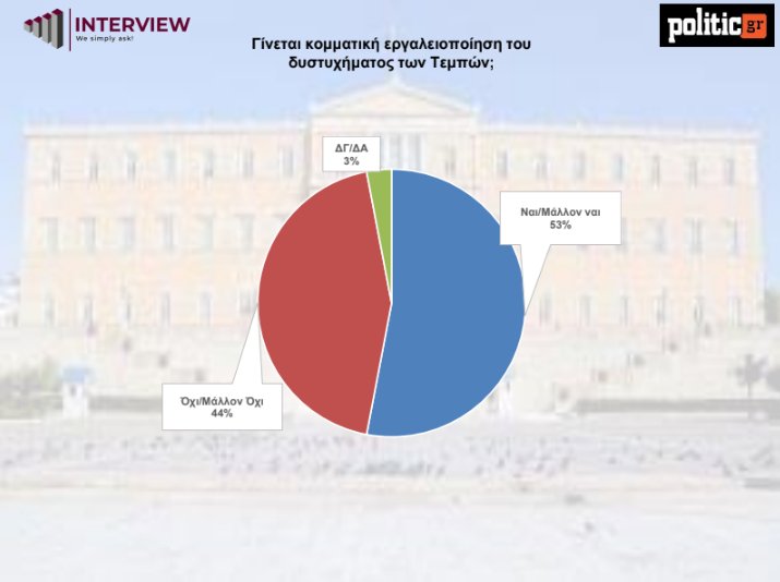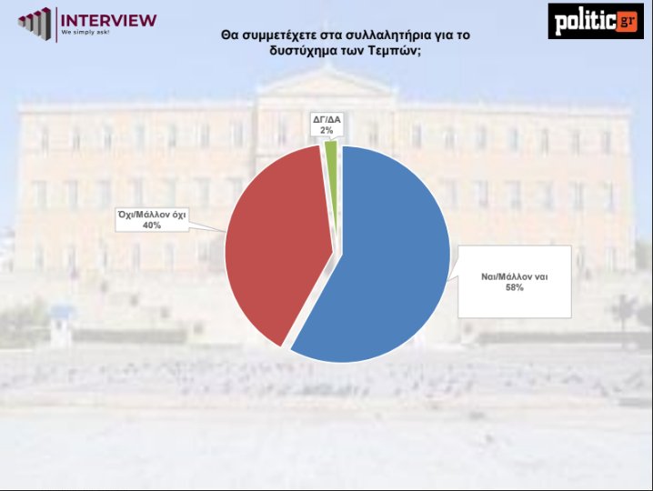 Στην ίδια δημοσκόπηση μετρήθηκε, επίσης, η πιθανή συμμετοχή στα συλλαλητήρια για τα Τέμπη με το 58% των ερωτηθέντων να απαντά ότι θα λάβει μέρος και το 40% να δηλώνει «όχι» ενώ το 53% πιστεύει ότι γίνεται κομματική εργαλειοποίηση με το 44% να διαφωνεί.