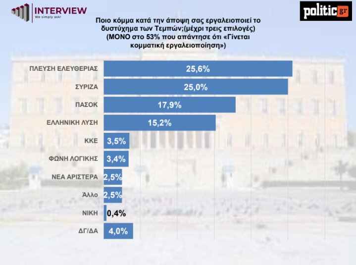 Σύμφωνα με το 53% που θεωρεί ότι γίνεται πολιτική εργαλειοποίηση, η Πλεύση Ελευθερίας καταγράφεται πρώτη με 25,6%, ο ΣΥΡΙΖΑ δεύτερος με 25%, ενώ ακολουθούν το ΠΑΣΟΚ με 17,9% και η Ελληνική Λύση με 15,2%.