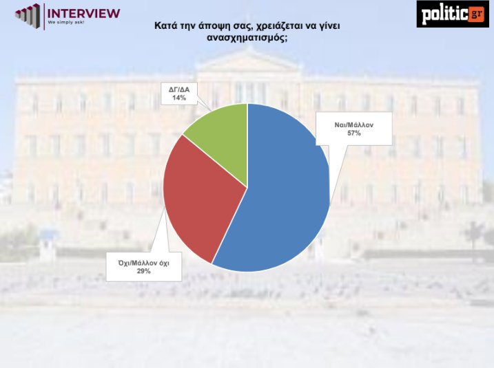 Η πολιτική φθορά και η δυσαρέσκεια προς το υπάρχον κυβερνητικό σχήμα αποτυπώνονται και στο υψηλό ποσοστό (57%) αυτών που θεωρούν ότι είναι αναγκαίος ένας ανασχηματισμός, σε αντίθεση με το 29% που θεωρεί ότι δεν χρειάζεται κάποια ανανέωση προσώπων.