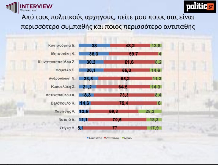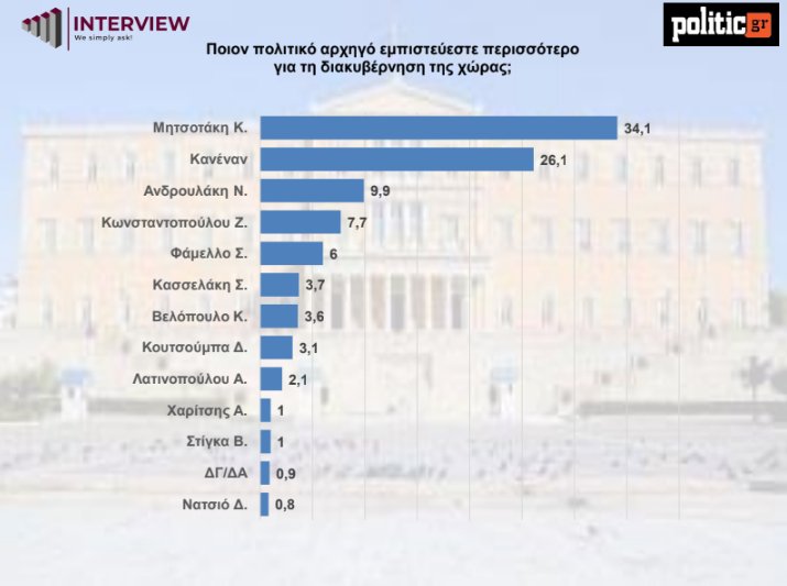 Στο ερώτημα για τον πολιτικό που εμπιστεύονται περισσότερο οι πολίτες για τη διακυβέρνηση της χώρας, ο Κυριάκος Μητσοτάκης συγκεντρώνει 34,1% ενώ ακολουθούν ο «Κανένας» με 26,1%, ο Νίκος Ανδρουλάκης με 9,9%, η Ζωή Κωνσταντοπούλου με 7,7% και ο Σωκράτης Φάμελλος με 6%.