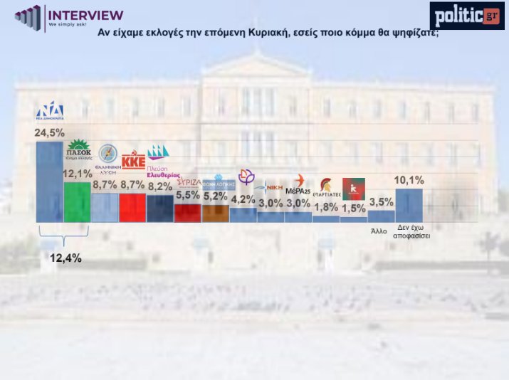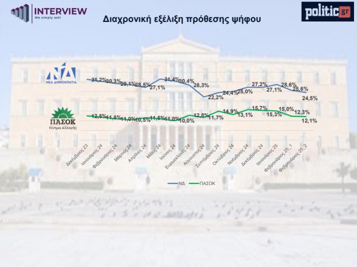 Χαμηλότερο κατά 4,1% είναι το ποσοστό που καταγράφει η ΝΔ στην πρόθεση ψήφου σε σχέση με έναν μήνα πριν, σύμφωνα με δημοσκόπηση της Interview για την ιστοσελίδα politic.gr. Απώλειες ωστόσο καταγράφει και το ΠΑΣΟΚ κατά 2,9%. Η διαφορά μεταξύ του μειώθηκε στο 12,4% (από 13,6%).