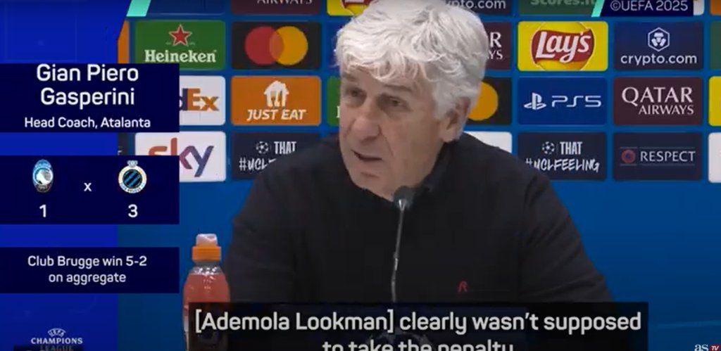 Η Αταλάντα αποκλείστηκε, από τη συνέχεια του Champions League, χάνοντας 3-1, στο Μπέργκαμο, από την Κλαμπ Μπριζ, με τον Αντεμόλα Λούκμαν να αστοχεί σε εκτέλεση πέναλτι και τον Τζαν Πιέρο Γκασπερίνι να λέει, δημόσια, πως ο Νιγηριανός επιθετικός είναι ο χειρότερος εκτελεστής από την άσπρη βούλα που έχει δει ποτέ του.