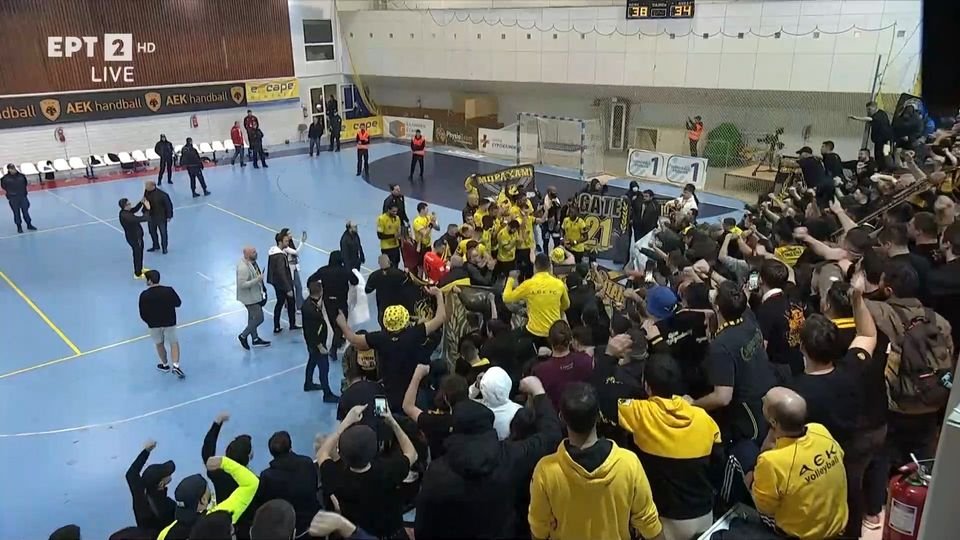 Η ομάδα χάντμπολ της ΑΕΚ πήρε μεγάλη νίκη στο ΟΑΚΑ επί του Ολυμπιακού με 38-34 και έτσι «κλείδωσε» την πρώτη θέση της κανονικής διάρκειας του Πρωταθλήματος της Handball Premier, παίρνοντας παράλληλα το πλεονέκτημα έδρας στα πλέι οφ. Μετά από αυτό το μεγάλο αποτέλεσμα, παίκτες και οπαδοί της Ένωσης ξέσπασαν σε τρελούς πανηγυρισμούς με τη λήξη της αναμέτρησης.