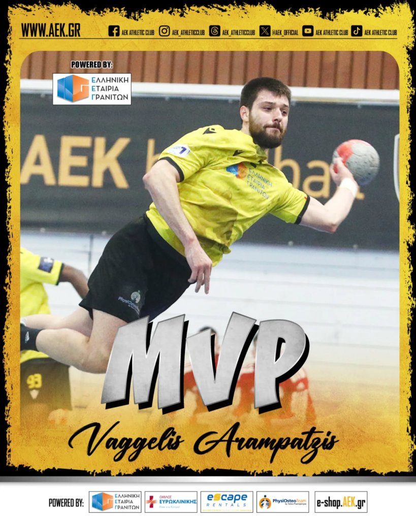 Η ΑΕΚ επικράτησε με 38-34 του Ολυμπιακού στην αίθουσα «Γ. Κασιμάτης» του ΟΑΚΑ, στο πλαίσιο της 18ης αγωνιστικής του Πρωταθλήματος της Handball Premier και έτσι η Ένωση «κλείδωσε» την υπόθεση πρωτιά στην κανονική περίοδο. Μετά το τέλος της αναμέτρησης ο Βαγγέλης Αραμπατζής, που ήταν πρώτος σκόρερ, βρίσκοντας το δρόμο προς τα δίχτυα 8 φορές, ήταν αυτός που κέρδισε τον τίτλο του MVP «Ελληνική Εταιρία Γρανιτών Α.Β.Ε.Ε.»!