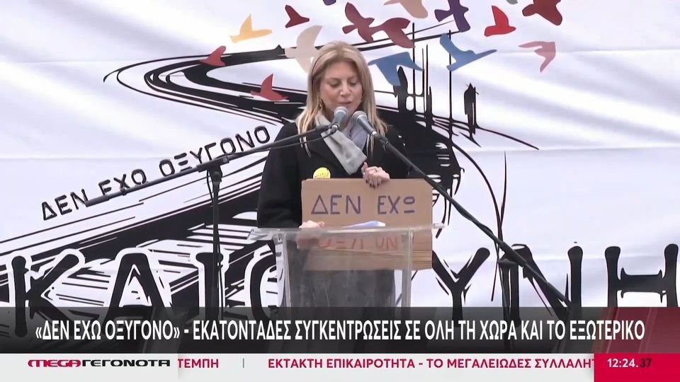 Κρατώντας ένα πανό που έγραφε «δεν έχω οξυγόνο», η Μαρία Καρυστιανού βρέθηκε στο μεγάλο συλλαλητήριο της Αθήνας και ανέβηκε στο βήμα στην πλατεία του Συντάγματος, μιλώντας για τις 57 ψυχές που χάθηκαν την ημέρα της τραγωδίας των Τεμπών.
