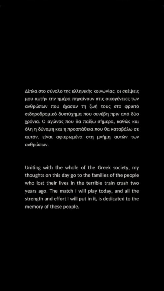 Δίπλα στο σύνολο της ελληνικής κοινωνίας, οι σκέψεις μου αυτήν την ημέρα πηγαίνουν στις οικοκεγένειες των ανθρώπων που έχασαν τη ζωή τους στο φρικτό σιδηροδρομικό δυστύχημα που συνέβη πριν από δύο χρόνια. Ο αγώνας που θα παίξω σήμερα, καθώς και όλη η δύναμη και η προσπάθεια που θα καταβάλω σε αυτόν, είναι αφιερωμένα στη μνήμη αυτών των ανθρώπων.