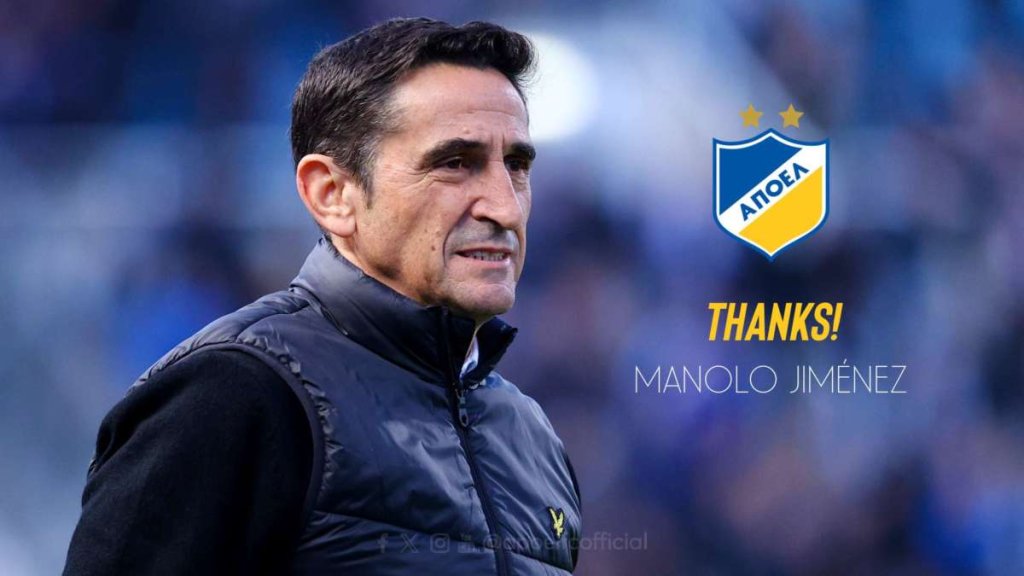 "Η εταιρεία ΑΠΟΕΛ ΠΟΔΟΣΦΑΙΡΟ (ΔΗΜΟΣΙΑ) ΛΤΔ ανακοινώνει την κοινή συναινέσει ολοκλήρωση της συνεργασίας της, με τον προπονητή Manolo Jiménez και τους συνεργάτες του, Jesús Calderón, Sebastián López και Jacobo Sanz.