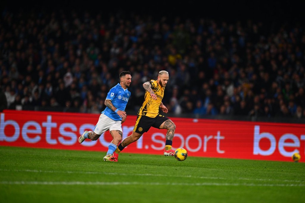 Η προσέγγιση της Νάπολι ήταν διαφορετική. Ο Κόντε επέλεξε ένα 4-3-3, με τον αριστερό μπακ Λεονάρντο Σπινατσόλα να δίνει το πλάτος που χρειαζόταν και τον αριστερό εξτρέμ, Τζιάκομο Ρασπαντόρι να κλείνει προς τα μέσα και να είναι κάτι σαν δεύτερος επιθετικός, έτσι ώστε οι «παρτενοπέι» να δημιουργήσουν υπεραριθμία στον άξονα, αλλά και να έχει αρκετά μέτρα ο Σπινατσόλα για να τρέξει.