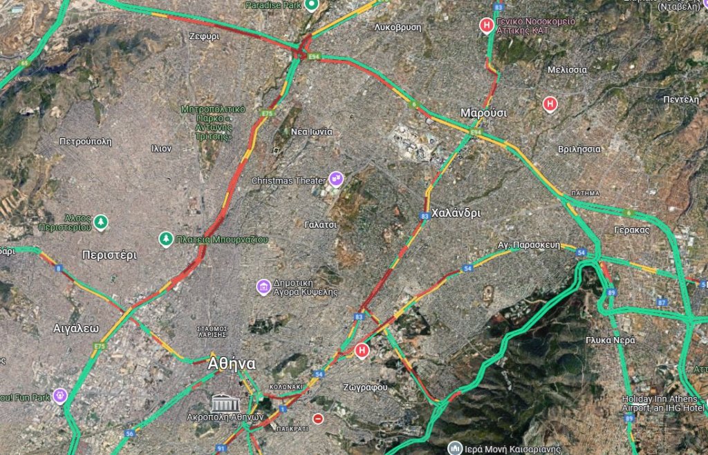 Ειδικότερα, όπως φαίνεται και στον χάρτη (κεντρική φωτό), στο «κόκκινο» είναι η Αττική Οδός, η λεωφόρος Κηφισού και η λεωφόρος Κηφισίας, καθώς και τμήματα της λεωφόρου Μεσογείων.