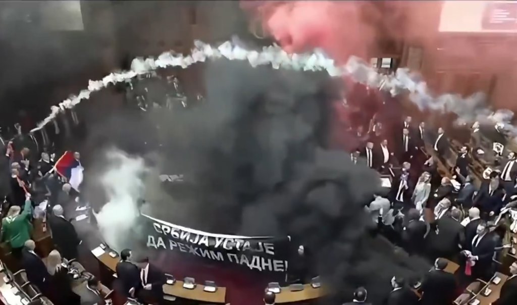 ???? Chaos erupts in Serbia's parliament! Opposition MPs unleashed smoke grenades & tear gas today, protesting government policies & backing student demos. A dramatic showdown in Belgrade, echoing months of unrest over corruption & transparency. ???????? #SerbiaProtests #PoliticalCrisis pic.twitter.com/9aoZeiAAYU