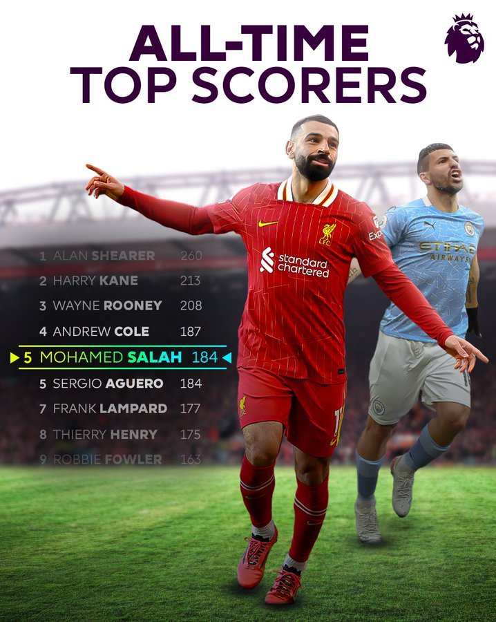 Ωστόσο, απόψε ο Σαλάχ έγραψε ιστορία, καθώς έφτασε τα 184 τέρματα στην καριέρα του σε επίπεδο Premier League, πιάνοντας στην 5η θέση των σκόρερ όλων των εποχών τον Κουν Αγουέρο!