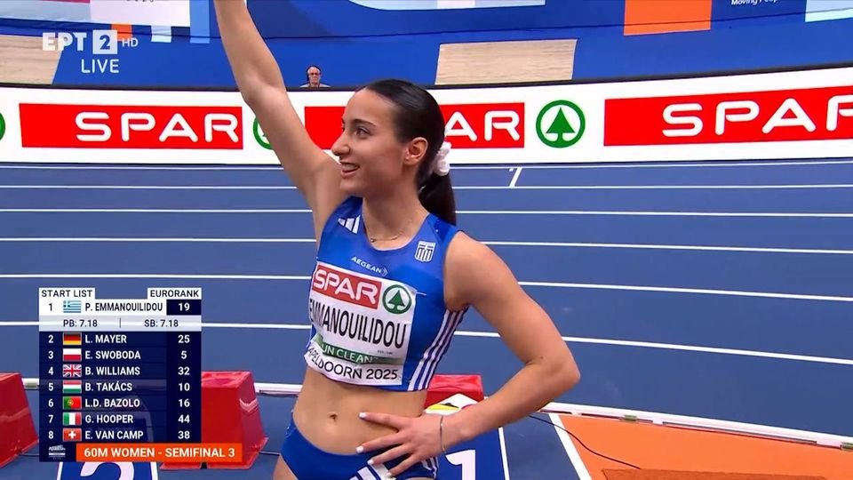 Μια αξιοπρεπέστατη εμφάνιση που της δίνει μια ακόμη πολύτιμη εμπειρία για τη συνέχεια έκανε η Πολυνίκη Εμμανουηλίδου. Η 21χρονη σπρίντερ στον ημιτελικό των 60 μ. στο Ευρωπαϊκό πρωτάθλημα κλειστού στίβου που γίνεται στο Άπελντοορν, τερμάτισε στην πέμπτη θέση της 3ης σειράς με 7.22. Επίδοση που στο σύνολο της έδωσε την 17η θέση.