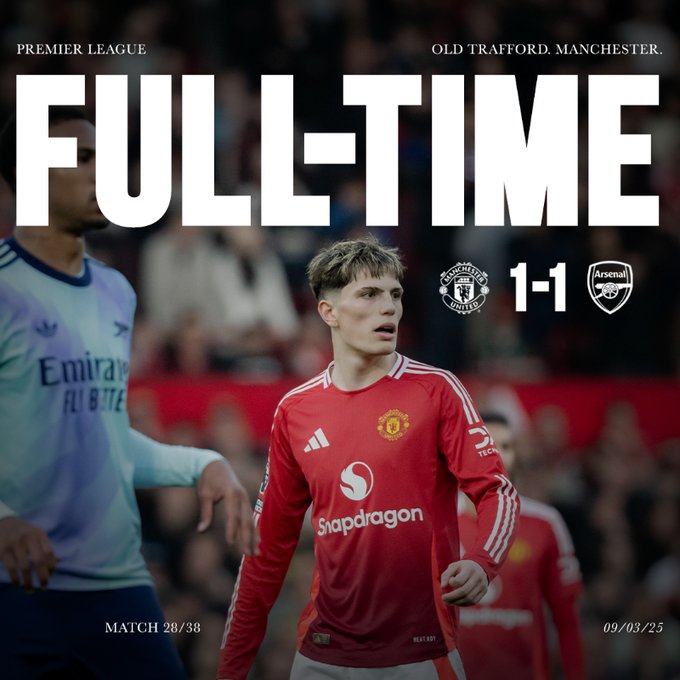 Στο «Χ» έκατσε η μπίλια στο ντέρμπι της Μάντσεστερ Γιουνάιτεντ με την Άρσεναλ, με τις δύο ομάδες να μένουν στο 1-1. Στο -15 από την πρωτοπόρο Λίβερπουλ οι «κανονιέρηδες» αλλά με ματς λιγότερο, μόλις 34 οι βαθμοί για τη Γιουνάιτεντ.
