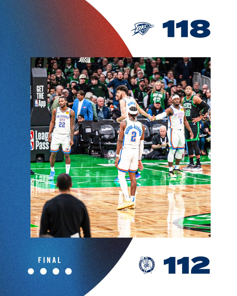 Η Θάντερ έφτασε τις 17 νίκες στα 18 τελευταία παιχνίδια της, έχοντας για πρώτο σκόρερ τον Σάι Γκίλτζιους-Αλεξάντερ με 34 πόντους (9/13 δίποντα, 2/7 τρίποντα, 10/11 βολές). Πολύ καλός ο Τσετ Χόλμγκρεν με 23 πόντους και 15 ριμπάουντ. Οι παίκτες των Σέλτικς είχαν 63 προσπάθειες για τρίποντο, ρεκόρ ομάδας, ευστοχώντας στα 20 από αυτά. Ο Τζέισον Τέιτουμ ξεχώρισε, από την ομάδα της Βοστώνης, πετυχαίνοντας 33 πόντους.