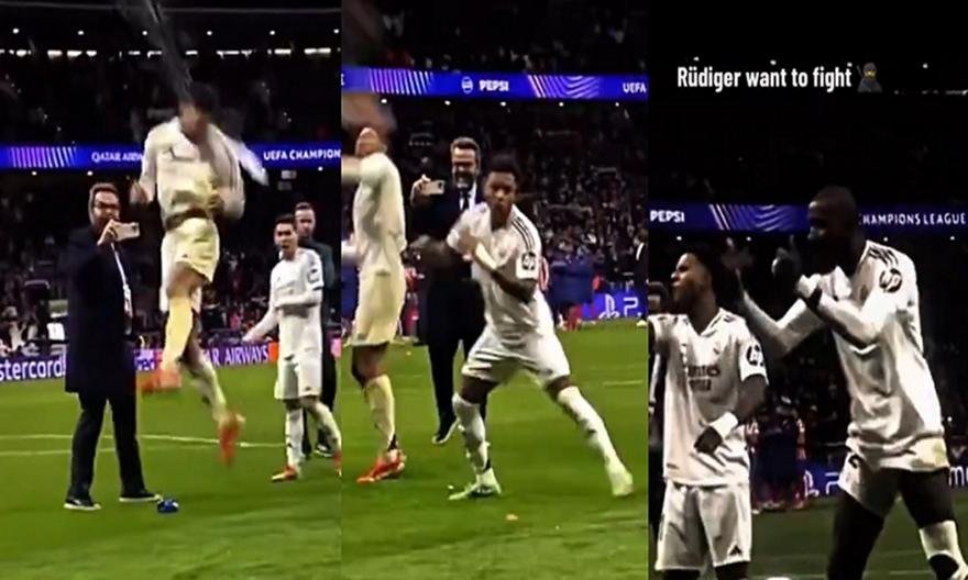 Από τις εξέδρες, πετάχτηκαν μπουκάλια προς τους παίκτες της Ρεάλ, με τον Τζουντ Μπέλινγκχαμ να μην πτοείται και να παίζει... κεφαλιές με τα μπουκάλια. Την ίδια στιγμή, ο Αντόνιο Ρίντιγκερ έδειχνε έτοιμος για καυγά.
