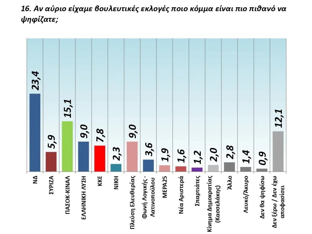 Στην τρίτη θέση ισοψηφούν η Πλεύση Ελευθερίας και η Ελληνική Λύση με 9%, ενώ το ΚΚΕ συγκεντρώνει 7,8% και βρίσκεται στην τέταρτη θέση.