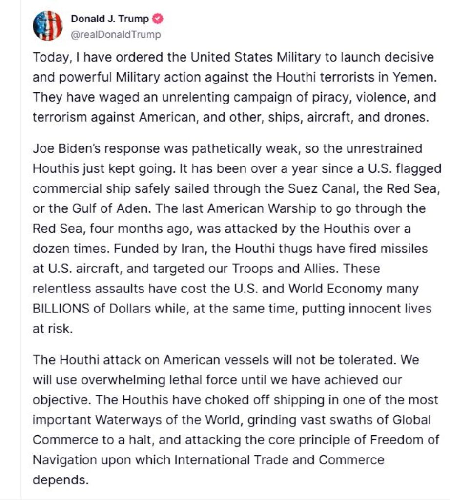 Γράφοντας ο ίδιος στην πλατφόρμα Truth Social επικαλέστηκε τις επιθέσεις των φιλοϊρανών ανταρτών κατά των πλοίων στην Ερυθρά Θάλασσα και προειδοποίησε ότι αν δεν σταματήσουν οι επιθέσεις κατά των εμπορικών πλοίων και των αμερικανικών πολεμικών πλοίων, «η κόλαση θα πέσει επάνω σας και δεν θα έχετε ξαναδεί ποτέ κάτι τέτοιο».