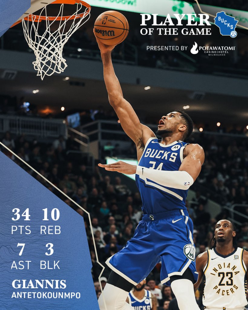 Στα όρια του τριπλ-νταμπλ έφτασε ο Γιάννης Αντετοκούνμπο, πραγματοποιώντας άλλη μια εξαιρετική εμφάνιση, στη νίκη των Μιλγουόκι Μπακς απέναντι στους Ιντιάνα Πέισερς.
