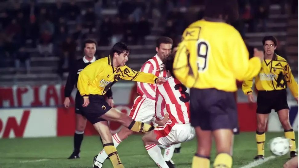 Σαν σήμερα πριν 29 χρόνια, η ΑΕΚ ήταν μέσα στη διεκδίκηση του πρωταθλήματος και προσπαθούσε να μείνει στη διαφορά του ενός βαθμού πίσω από τον Παναθηναϊκό. Η επίσκεψη στο παλιό Στάδιο Καραϊσκάκη για το ντέρμπι με τον… παλιό Ολυμπιακό που ακόμα δεν είχε αλώσει το ποδόσφαιρο και έμενε μακριά από τη διεκδίκηση του τίτλου, ήταν ένα πολύ κρίσιμο τεστ.