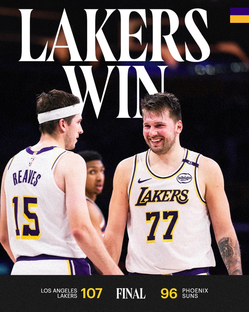 Έπειτα από τέσσερις διαδοχικές ήττες, μακριά από το Λος Άντζελες, οι Λέικερς επέστρεψαν στο σπίτι τους και στις νίκες, με το 107-96 επί των Φίνιξ Σανς, διευρύνοντας το αήττητο σερί τους εντός έδρας. Σε ακόμα ένα παιχνίδι, ο Λεμπρόν έμεινε εκτός, λόγω τραυματισμού και ο Λούκα Ντόντσιτς ανέλαβε να οδηγήσει την ομάδα στη νίκη, φτάνοντας κοντά σε τριπλ-νταμπλ. Από τα πρώτα λεπτά, οι Λέικερς επέβαλλαν την κυριαρχία τους, προηγήθηκαν 20-9 και, προτού τελειώσει η πρώτη περίοδο, βρέθηκαν και στο +20, 31-11. Ο Ντόντσιτς σκόραρε και δημιουργούσε, με τους Λέικερς να προηγούνται 54-37 στο ημίχρονο και να συνεχίζουν στον ίδιο ρυθμό και στην επανάληψη. Οι Σανς κατάφεραν να κατεβάσουν τη διαφορά σε μονοψήφιο νούμερο, αλλά δεν μπορούσαν κάτι καλύτερο από αυτό. Όταν μείωσαν σε 100-92, 2:03 λεπτά για το τέλος, οι Λέικερς απάντησαν με τρίποντο και "κλείδωσαν" την έβδομη νίκη τους στα επτά τελευταία παιχνίδια μπροστά στο κοινό τους.