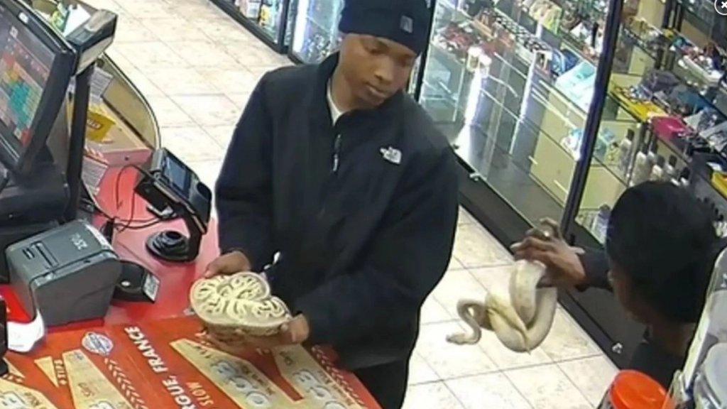 Στο βίντεο που έδωσε στην επιφάνεια το γραφείο του σερίφη της κομητείας Μάντισον φαίνονται δύο από τους ληστές να βρίσκονται μέσα στο κατάστημα. Τότε ο ένας από τους δύο πλησιάζει τον πάγκο του ιδιοκτήτη και αφήνει πάνω ένα φίδι.