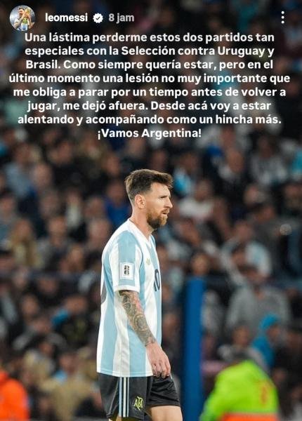 «Είναι κρίμα που χάνω αυτά τα δύο τόσο ξεχωριστά παιχνίδια με την εθνική ομάδα κόντρα στην Ουρουγουάη και τη Βραζιλία. Όπως πάντα, ήθελα να είμαι παρών, αλλά, την τελευταία στιγμή, ένας τραυματισμός, όχι πολύ σοβαρός, με αναγκάζει να μείνω εκτός για λίγο. Θα παρακολουθώ και θα υποστηρίζω την ομάδα ως οπαδός. Πάμε Αργεντινή».