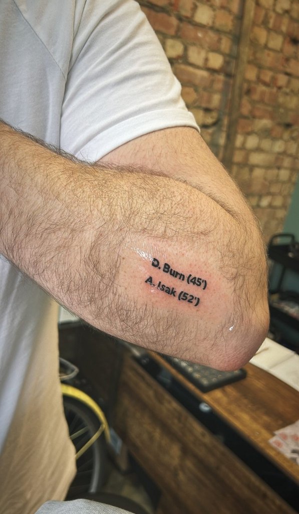 Όμως ένας οπαδός της Νιούκαστλ θέλησε να πάει τους πανηγυρισμούς ένα βήμα παραπέρα. Και αυτό γιατί αποφάσισε να «χτυπήσει» τατουάζ τους ήρωες του τελικού, Νταν Μπερν και Αλεξάντερ Ίσακ που πέτυχαν τα δυο τέρματα, ενώ δίπλα από τα ονόματα τους δεν παρέλειψε να προσθέσει και τα λεπτά στα οποία σκόραραν.