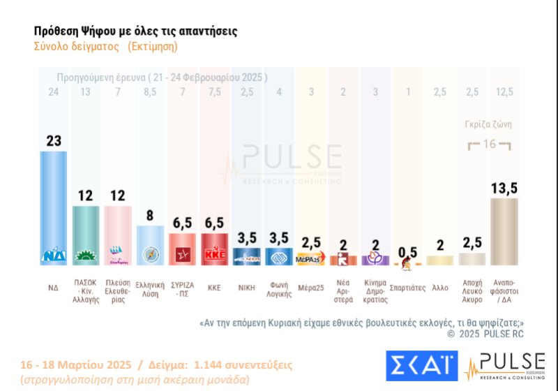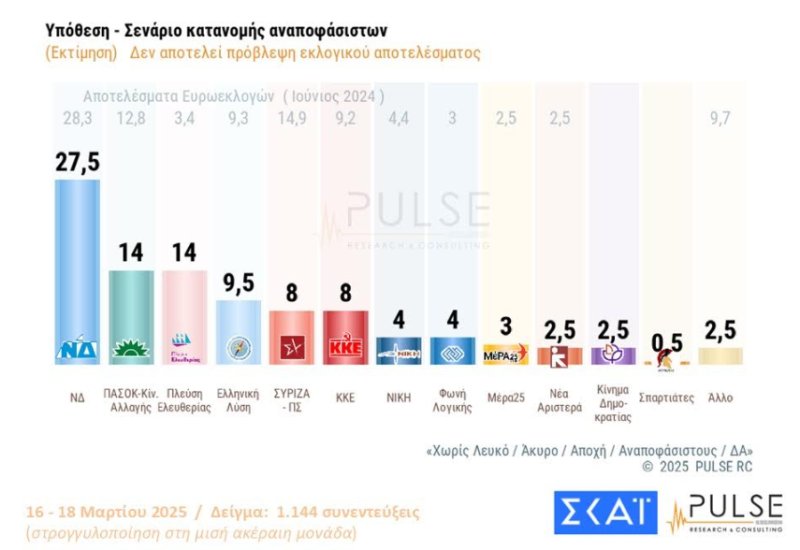 Η δημοσκόπηση που παρουσίασε ο ΣΚΑΪ, της εταιρείας Pulse και παρουσιάστηκε στο κεντρικό δελτίο ειδήσεων του σταθμού με τη Σία Κοσιώνη, επιβεβαίωσε το νέο πολιτικό σκηνικό που δείχνει να διαμορφώνεται.