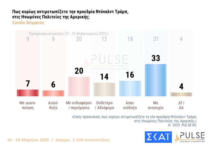 Η δημοσκόπηση της Pulse συμπεριέλαβε στο ερωτηματολόγιό της και τα μέχρι στιγμής δείγματα της προεδρίας του Ντόναλντ Τραμπ, ο οποίος, με τις αποφάσεις του, επανακαθορίζει τις ισορροπίες σε παγκόσμιο επίπεδο. Το 33% βλέπει την προεδρια του με «ανησυχία» και το 20% με «ενδιαφέρον-περιέργεια».