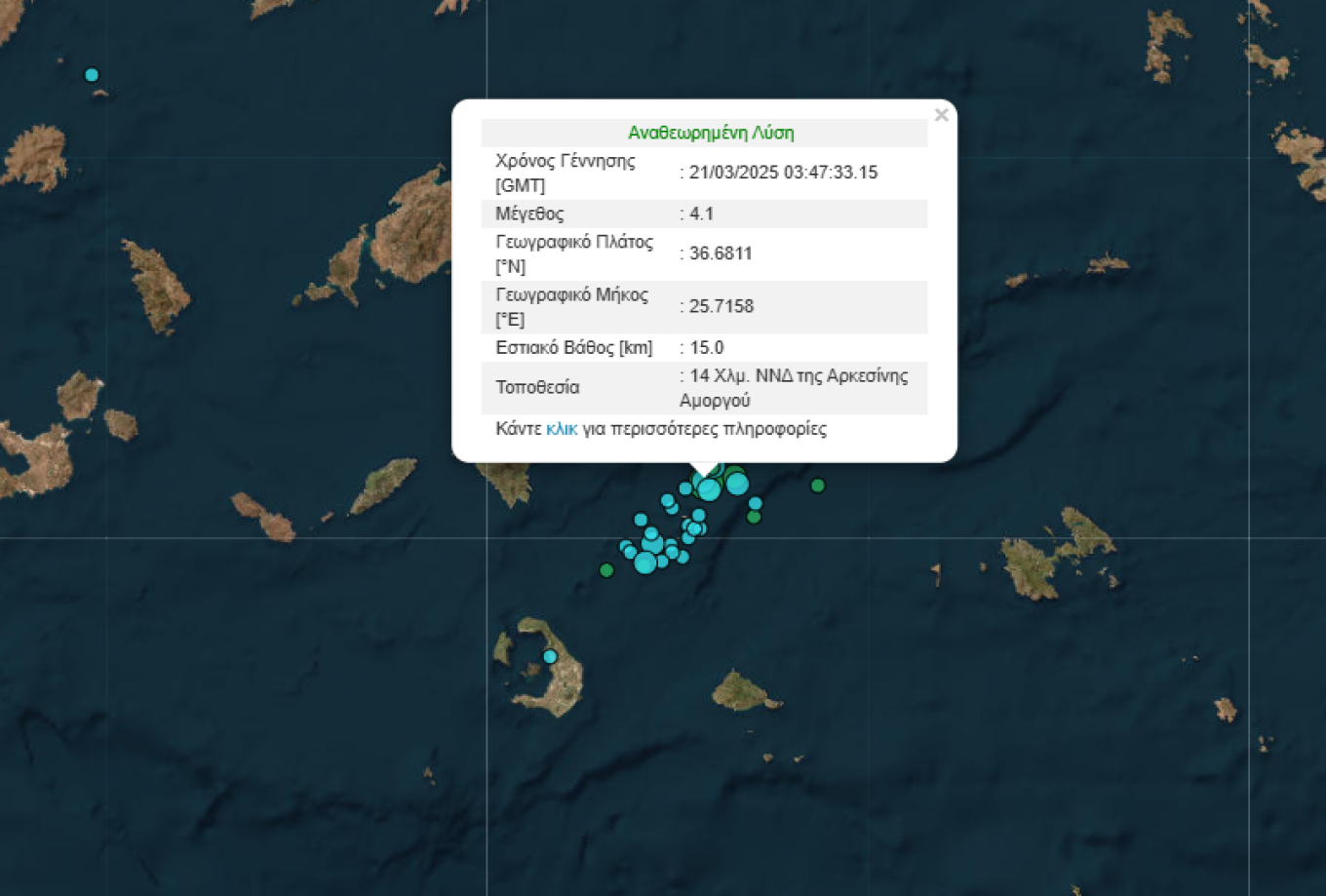 Το επίκεντρο της δόνησης εντοπίστηκε 14 χιλιόμετρα νότια νοτιοδυτικά της Αρκεσίνης Αμοργού και το εστιακό βάθος υπολογίστηκε στα 15 χιλιόμετρα, σύμφωνα με την Αναθεωρημένη Λύση του Γεωδυναμικού Ινστιτούτου.