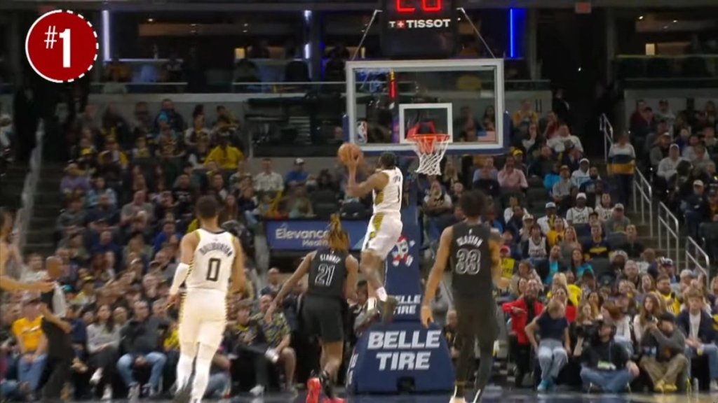 Με πάσα μισού γηπέδου, ο Ταϊρίς Χαλιμπέρτον βρήκε τον Όμπι Τόπιν και ο φόργουορντ των Πέισερς, με άλεϊ ουπ κάρφωμα 360 μοιρών, σκαρφάλωσε στην κορυφή του σημερινού NBA Top-5.