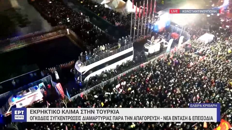 Εκατοντάδες χιλιάδες πολίτες στην Τουρκία αψήφησαν την απαγόρευση και συγκεντρώθηκαν έξω από το δημαρχείο της Κωνσταντινούπολης για ακόμη ένα βράδυ, προκειμένου να διαμαρτυρηθούν για την επίσημη αυτή τη φορά προφυλάκιση του Εκρέμ Ιμάμογλου για διαφθορά και την καθαίρεσή του από τη θέση του δημάρχου. Και για ακόμη ένα βράδυ βρέθηκαν αντιμέτωποι με την αστυνομική καταστολή, καθώς οι δυνάμεις ασφαλείας έκαναν χρήση αντλιών νερού, σπρέι πιπεριού αλλά και χημικών.