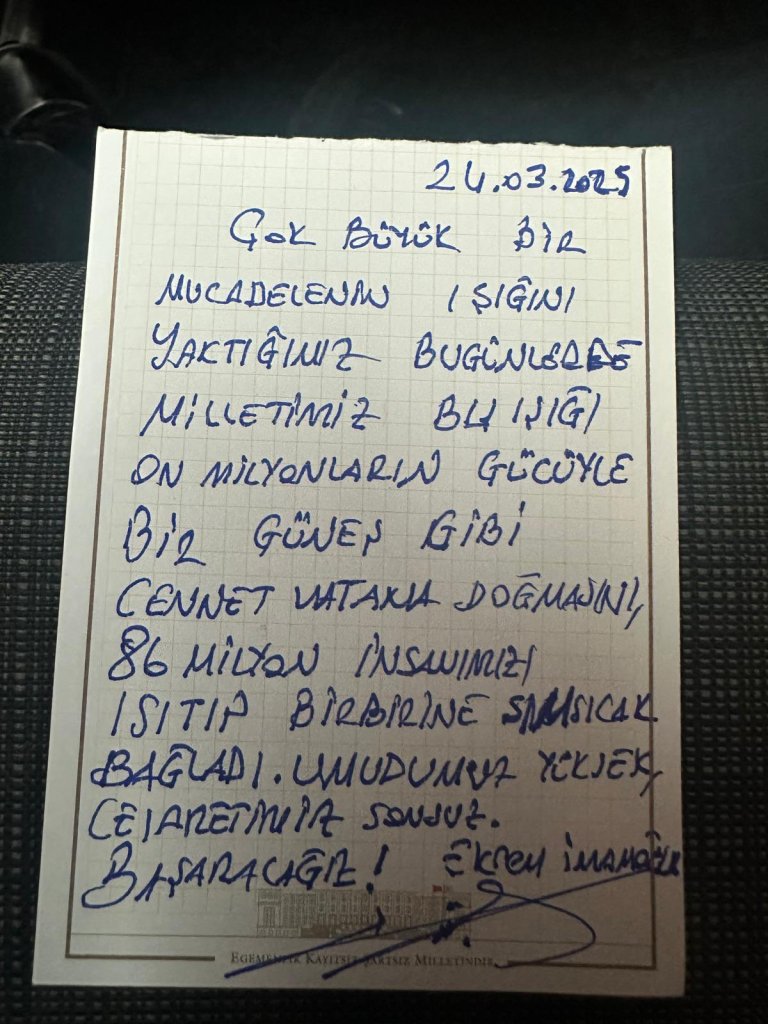 Ο Εκρέμ Ιμάμογλου δέχθηκε επίσκεψη στη φυλακή από τον βουλευτή του κόμματός του, Σεγίτ Τορούν, στον οποίο έδωσε ένα χειρόγραφο σημείωμα.