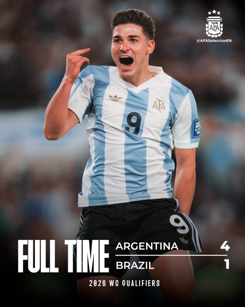 Λίγες ώρες πριν από το ντέρμπι στο "Μονουμεντάλ", η πρωτοπόρος Αργεντινή είχε μάθει ότι προκρίθηκε, απευθείας, στα τελικά του Παγκοσμίου Κυπέλλου 2026, μετά το Βολιβία-Ουρουγουάη 0-0. Απέναντι στη Βραζιλία, η Παγκόσμια Πρωταθλήτρια, χωρίς Μέσι και Λαουτάρο, ήταν καταιγιστική, συντρίβοντας 4-1 τους Βραζιλιάνους.