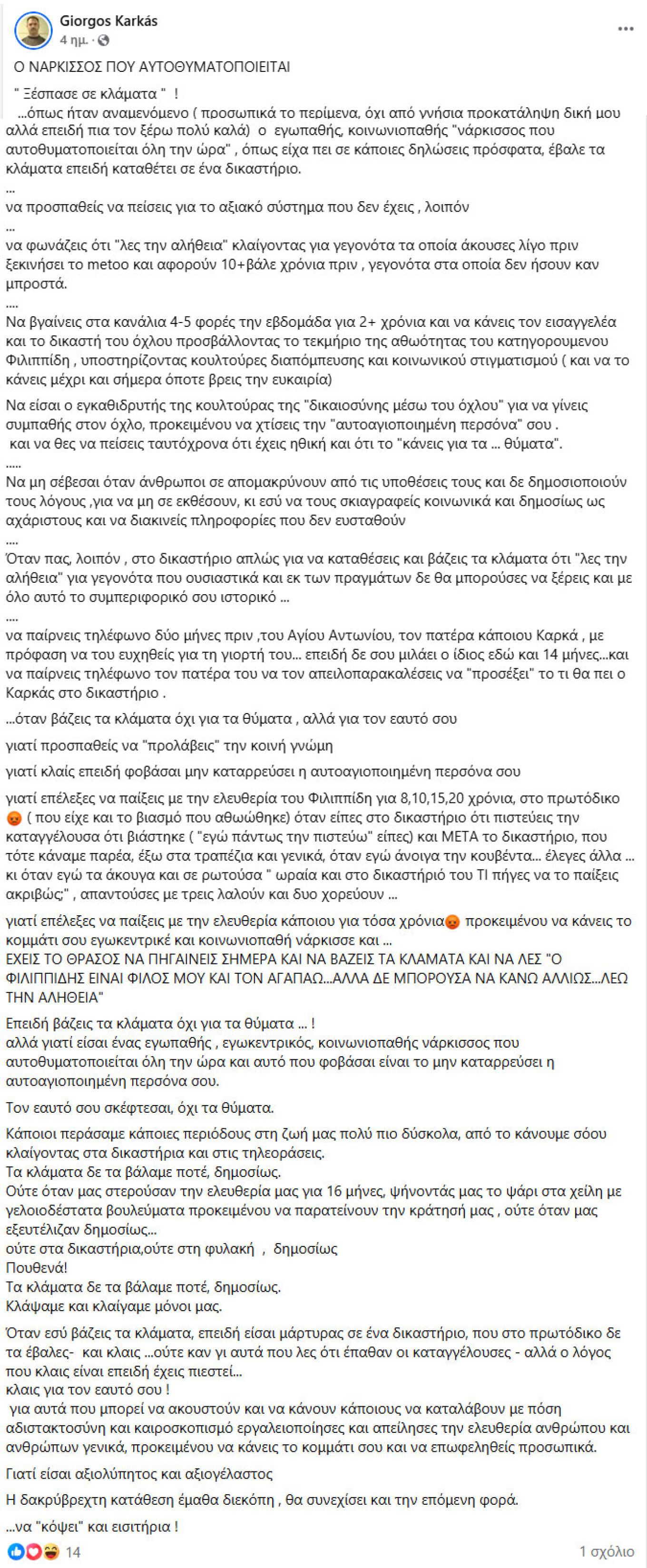 Η επίμαχη ανάρτηση έγινε το απόγευμα της περασμένης Παρασκευής με τον Γιώργο Καρκά να κάνει λόγο για «νάρκισσο που αυτοθυματοποιείται» σημειώνοντας για τον Σπύρο Μπιμπίλα - χωρίς να τον κατονομάζει - οτι «πια τον ξέρω πολύ καλά».