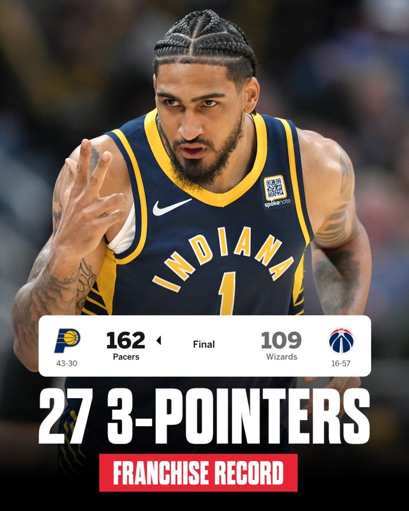Στην Ουάσινγκτον, οι Ιντιάνα Πέισερς κατέγραψαν επίδοση μοναδική, στα χρονικά της ομάδας, αφού έβαλαν 162 πόντους στη νίκη επί των Γουίζαρντς. Η ομάδα της Ιντιανάπολις είχε βάλει 157 πόντους σε ένα παιχνίδι, την περασμένη σεζόν, και τώρα κατέρριψε το ρεκόρ της, με το τελικό 162-109. Εννέα παίκτες των νικητών είχαν διψήφιο αριθμό πόντων με τους Πέισερς να προηγούνται 61-83 στο ημίχρονο και με 88-125 στο φινάλε της τρίτης περιόδου. Η ομάδα της Ιντιανάπολις τελείωσε την αναμέτρηση με 27/47 τρίποντα και 48 ασίστ, επιστρέφοντας στις νίκες, λίγες ώρες μετά την ήττα από τους Λέικερς, με buzzer beater του Λεμπρόν.