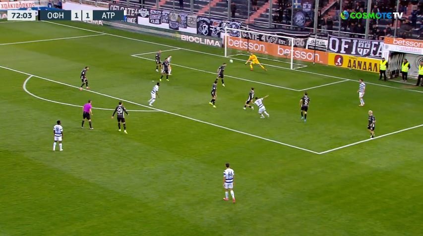 Στο 73’ ο Παλμεζάνο έπιασε πανέμορφο σουτ από δεξιά και ο Χριστογεώργος απογειώθηκε κι έβγαλε σε κόρνερ.