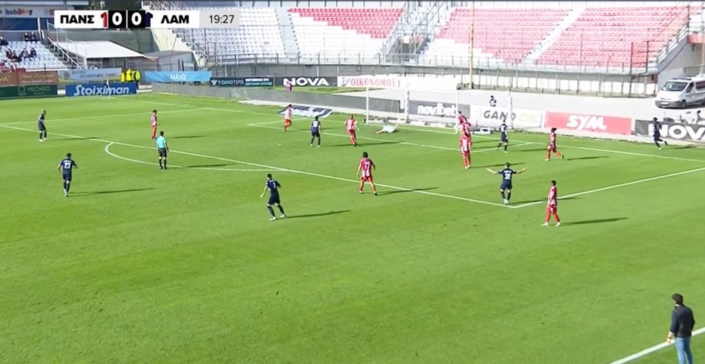 Πρώτη καλή στιγμή στο ματς από τη Λαμία στο 20ο λεπτό με ωραία συνεργασία των Σόρια και Τσιμπόλα, ο τελευταίος πέρασε στον Μπιλάλ που με κοντινό σουτ έστειλε την μπάλα στο κάθετο δοκάρι του Γκουγκεσασβίλι.