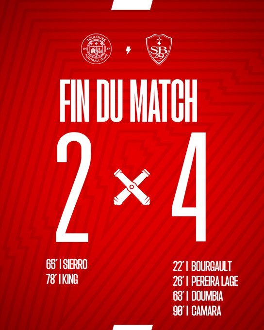 Μπορεί η Τουλούζ να μπήκε καλύτερα στην αναμέτρηση, όμως η Μπρεστ ήταν εκείνη που ευτύχισε να προηγηθεί μόλις στο 22ο λεπτό με τον αριστερό της μπακμ Μπουργκάλτ. Τέσσερα λεπτά μετά μάλιστα, οι φιλοξενούμενοι διπλασίασαν τα τέρματα τους με τον Περέιρα Λαζ έπειτα από πάσα του Ντούμπια. Στην επανάληψη ο μέσος της Μπρεστ από δημιουργός έγινε σκόρερ και έγραψε το 3-0 στο 62’. Τρία λεπτά μετά η Τουλούζ προσπάθησε να μπει ξανά στο παιχνίδι με τέρμα του Σιέρο. Στο 78’ ο Κινγκ έκανε το 3-2 δίνοντας άγρια ομορφιά στο παιχνίδι, παρόλα αυτά οι φιλοξενούμενοι με γκολ του Καμαρά στο 90’ κλείδωσαν το πολυπόθητο τρίποντο.